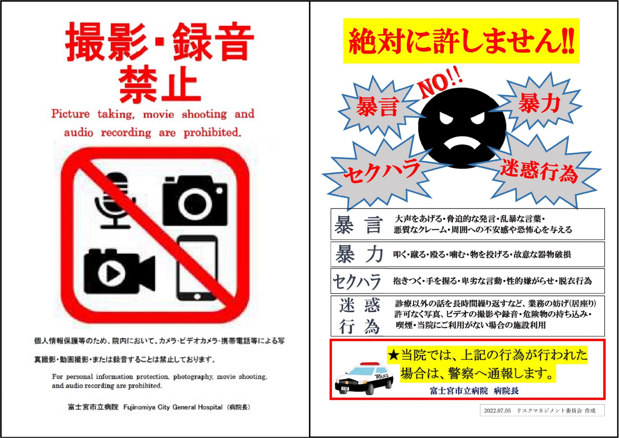 患者さん・病院職員のプライバシー及び院内における個人情報を保護するために「撮影・録音禁止」とします。