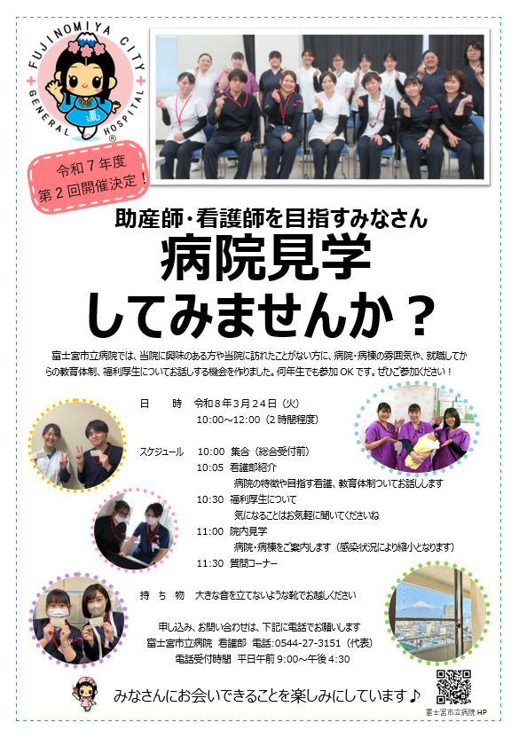 当院の雰囲気や福利厚生について知りたい看護学生さんに向けて、令和7年度「第2回病院見学会」を来年3月24日火曜日に開催します。 今年度は2か月に1回、採用試験を実施しています。採用試験受験の前に見学したい既卒者の方も大歓迎です。ご予約は電話で受け付けています。お一人での参加も、お友達との参加もOKです。みなさんのお電話をお待ちしています。