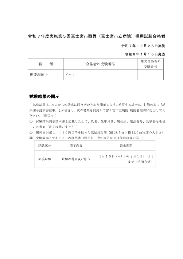 令和7年度第5回富士宮市職員(富士宮市立病院)採用試験結果